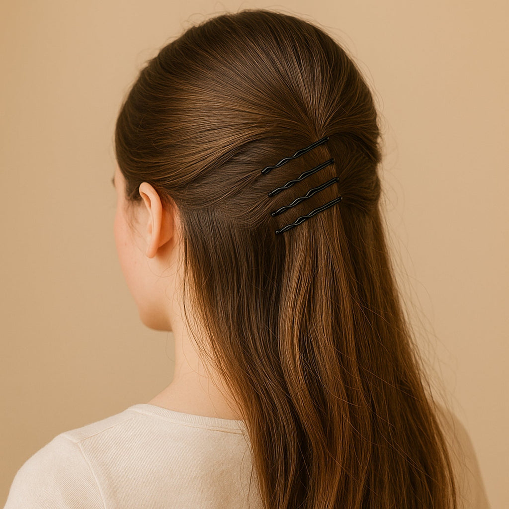 This Small Black Hair Bobby Pins Set offers a perfect combination of durability, flexibility, and strong grip for effortless hairstyling. Made with high-quality coated metal, these pins glide smoothly through hair without snagging or causing breakage. Their compact size and strong tension hold hair securely in place, making them ideal for creating buns, updos, or everyday styles. Whether for professional salon use or daily wear, these bobby pins are a must-have accessory for maintaining neat, stylish hair all day long. The smooth rounded tips ensure gentle handling, while the matte black finish blends seamlessly with all hair colors.