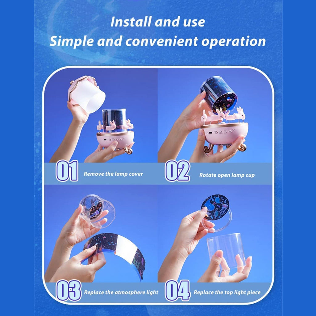 Transform your child’s room into a dreamy starry paradise with the Bunny’s Carousel Night Light Projector. This charming projector features adorable bunny figures rotating in a carousel, bathed in soft LED lights that create a mesmerizing sky full of stars and moons on walls and ceilings.